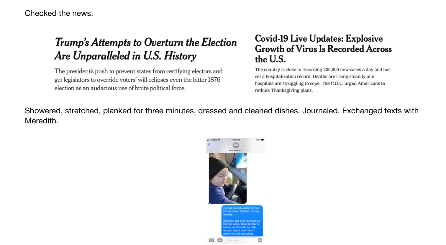 During this check-in, we talked a lot about the options made possible by journaling digitally. I shared this example of including screen shots of headlines and text exchanges in my entries.